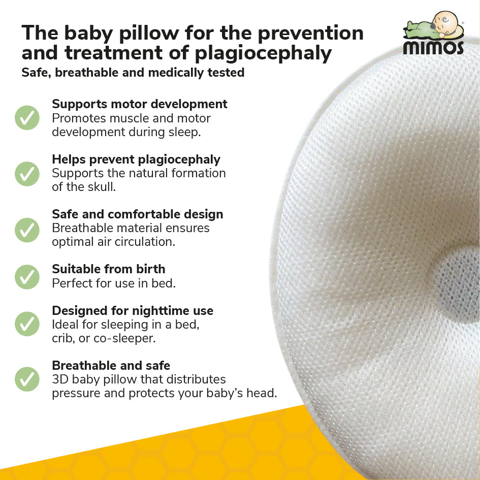 - Mimos Baby Pillow ensures gentle, even pressure distribution while your baby sleeps, helping to maintain a natural head shape overnight.